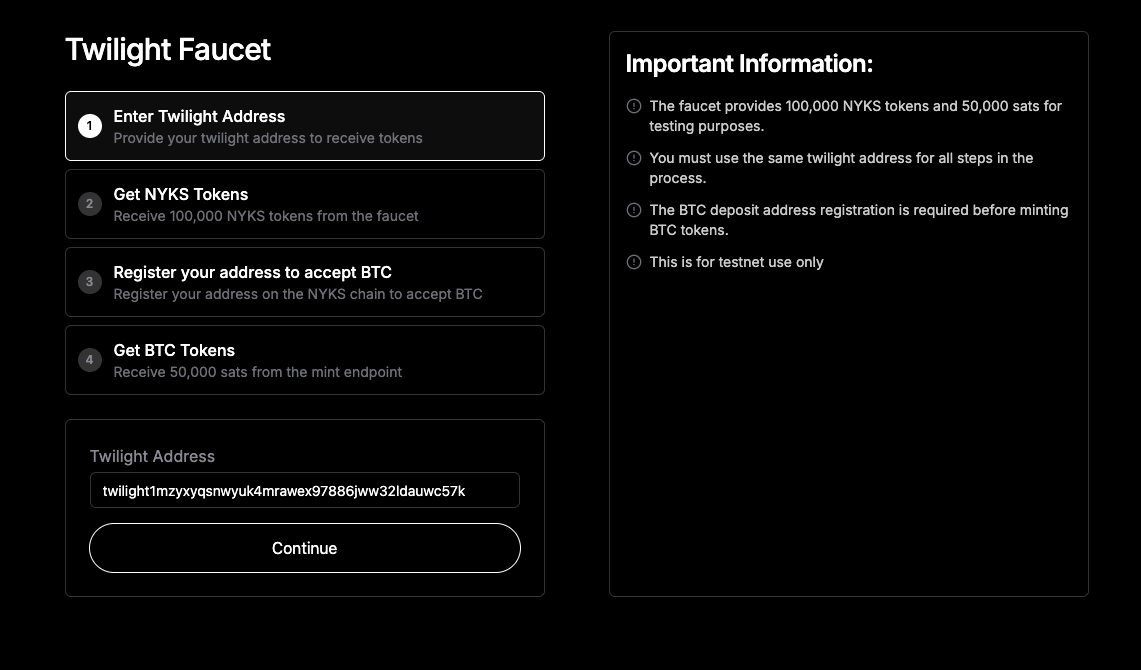 - Visit the Faucet on the Twilight Frontend site.